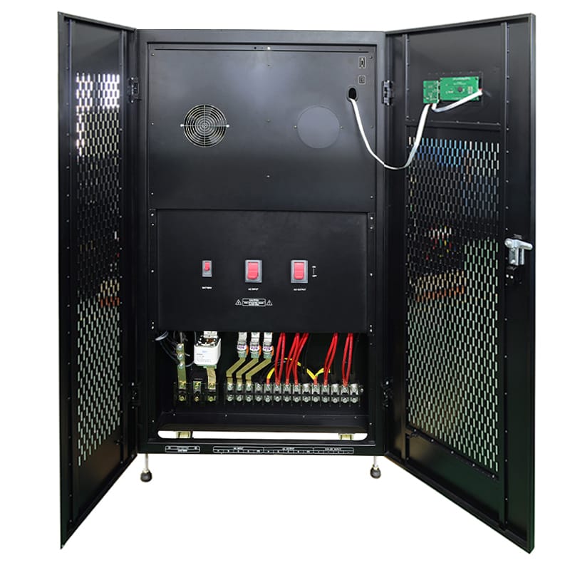 Next, I will show the appearance and interior of the 3 phase to single phase inverter 150kw and 160kw, as well as how to connect the 3 phase inverter. The solar controller can be built into the inverter, or can be a separate inverter. Built-in solar controller makes connection more convenient and saves installation space. External solar controllers make maintenance more convenient. When the mains power is normal, the mains power is output to the load after the inverter stabilizes the voltage and supplies power to the battery pack. When the mains power is interrupted, the inverter automatically switches to battery power supply, converting the DC power in the battery into AC power and outputting it to the load.